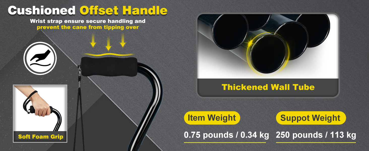 - Cushioned Offset Handle: equipped with a soft foam grip to reduce pressure on the hand and wrist, the cushioned offset handle offers additional balance and comfort; the firm yet comfortable grip and sturdy wrist strap ensure secure handling and prevent the cane from tipping over