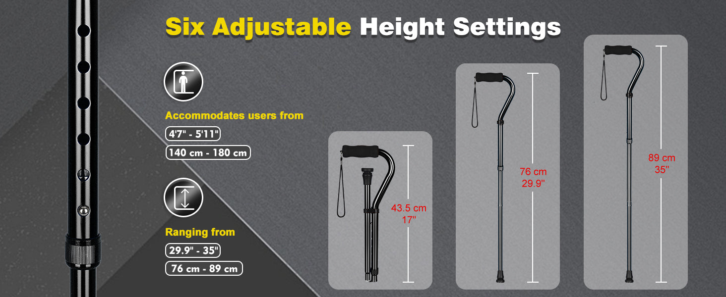 - Adjustable Height: our walking cane has six adjustable height settings, ranging from 31.5 to 36.5 inches, easily modified with a push of a button; this accommodates users from 4'9" to 6'1"; the adjustable feature ensures the cane fits comfortably, aligning with the user's wrist or hip joint; the screw-coupled joint prevents accidental readjustment, making the cane feel like a solid rigid walking stick