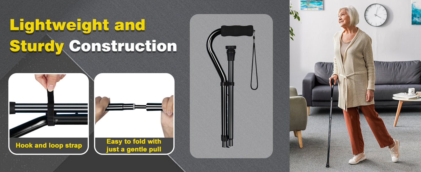 - Foldable and Portable Walking Aid: the walking cane features a compact and retractable bi-fold design, folding down to just 17 inches; this makes it easy to store and carry in backpacks, duffel bags, and wheelchair bags, providing convenience for the elderly and injured individuals on the go
