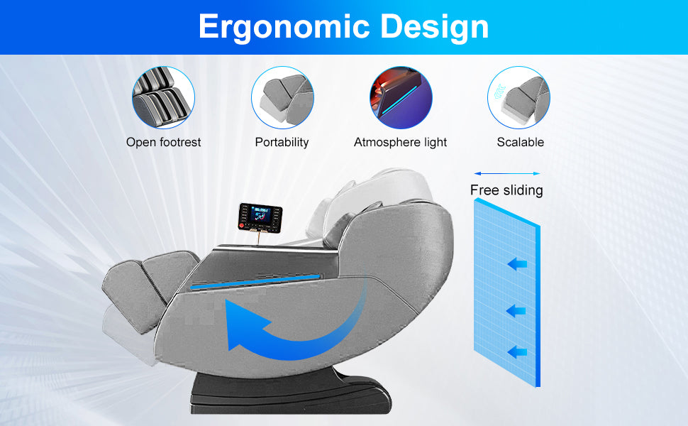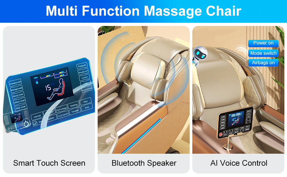 - AI Voice Control and Bluetooth Speaker: The massage chair features an LCD screen and a dual control system. It allows both manual control and AI voice control, freeing your hands. Simply communicate your needs to the chair, and the AI will initiate the corresponding program. Additionally, enjoy your favorite music while massaging with the built-in Bluetooth speaker.