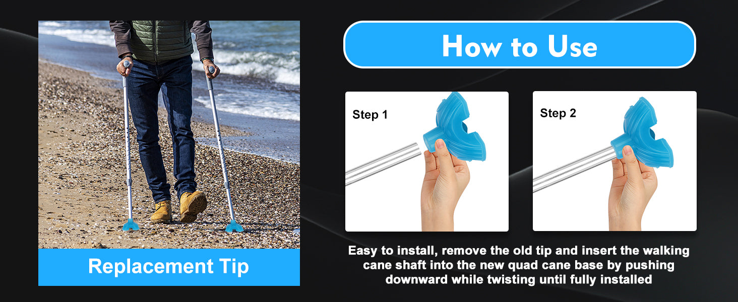 - Fits Most Offset and Folding Canes: designed to fit standard 3/4" canes and walking sticks; easy to install, remove the old tip and insert the walking cane shaft into the new quad cane base by pushing downward while twisting until fully installed