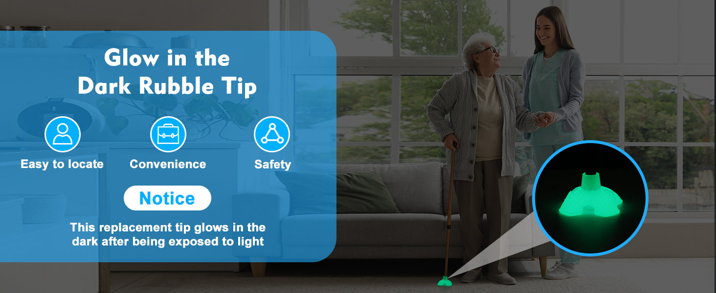 - Glow in the Dark Rubble Tip: this replacement tip glows in the dark after being exposed to light, making your walking stick or cane easier to locate at night, providing added convenience and safety