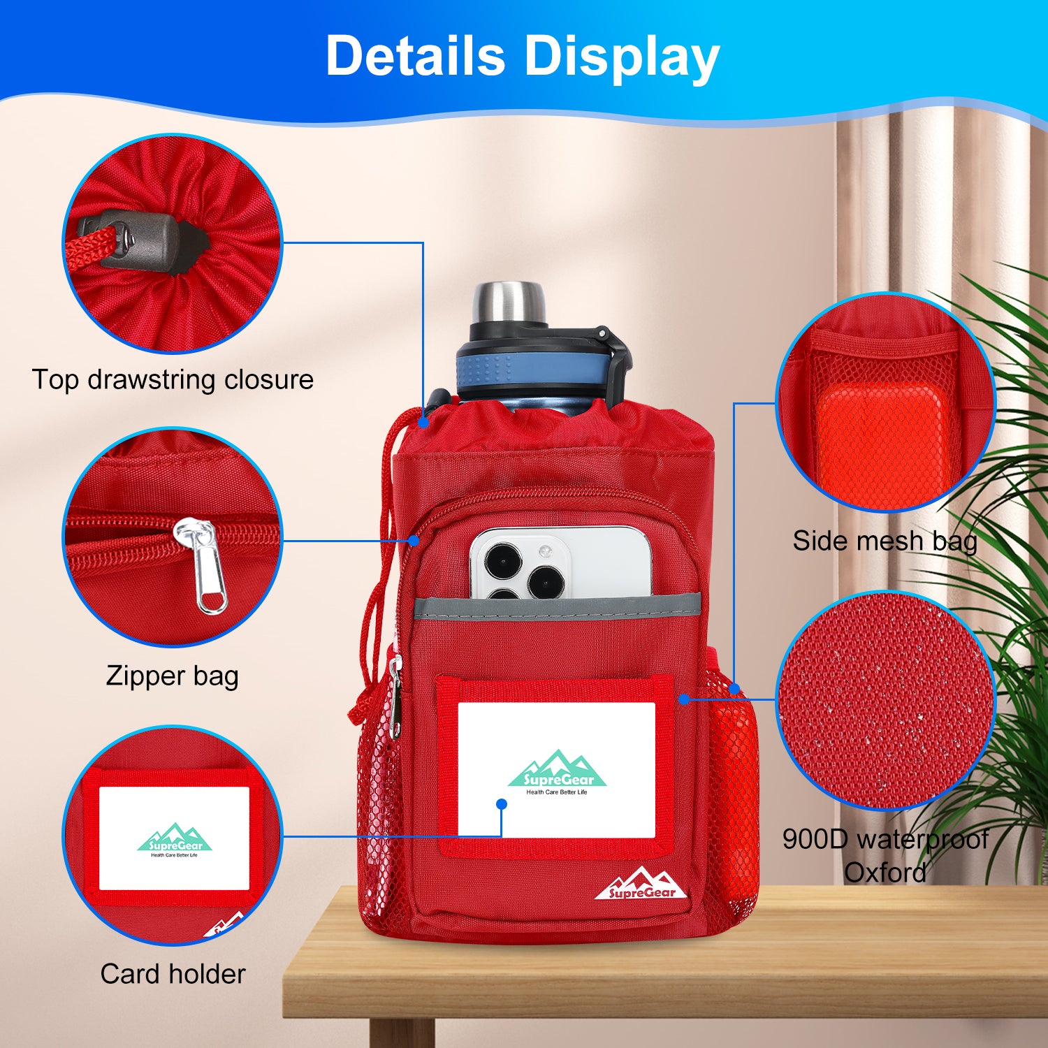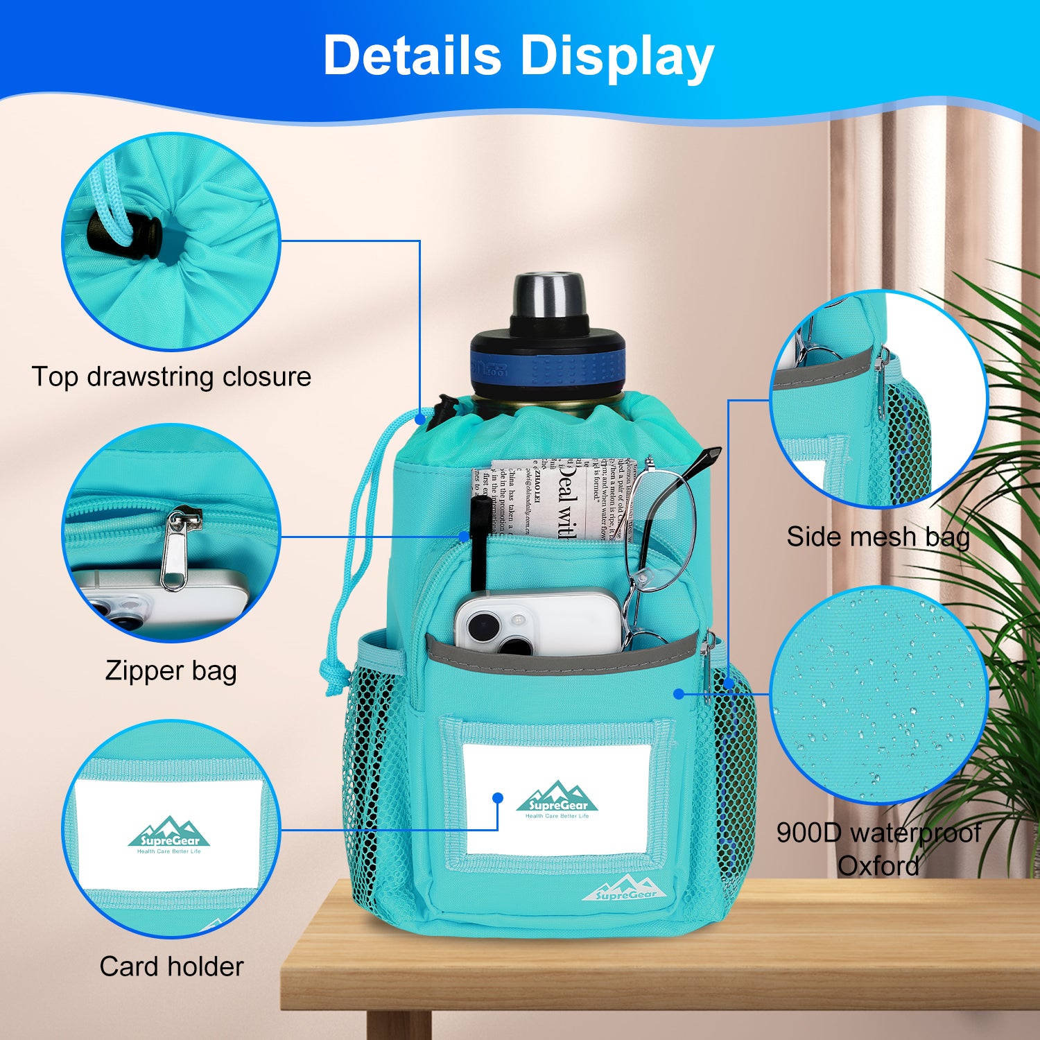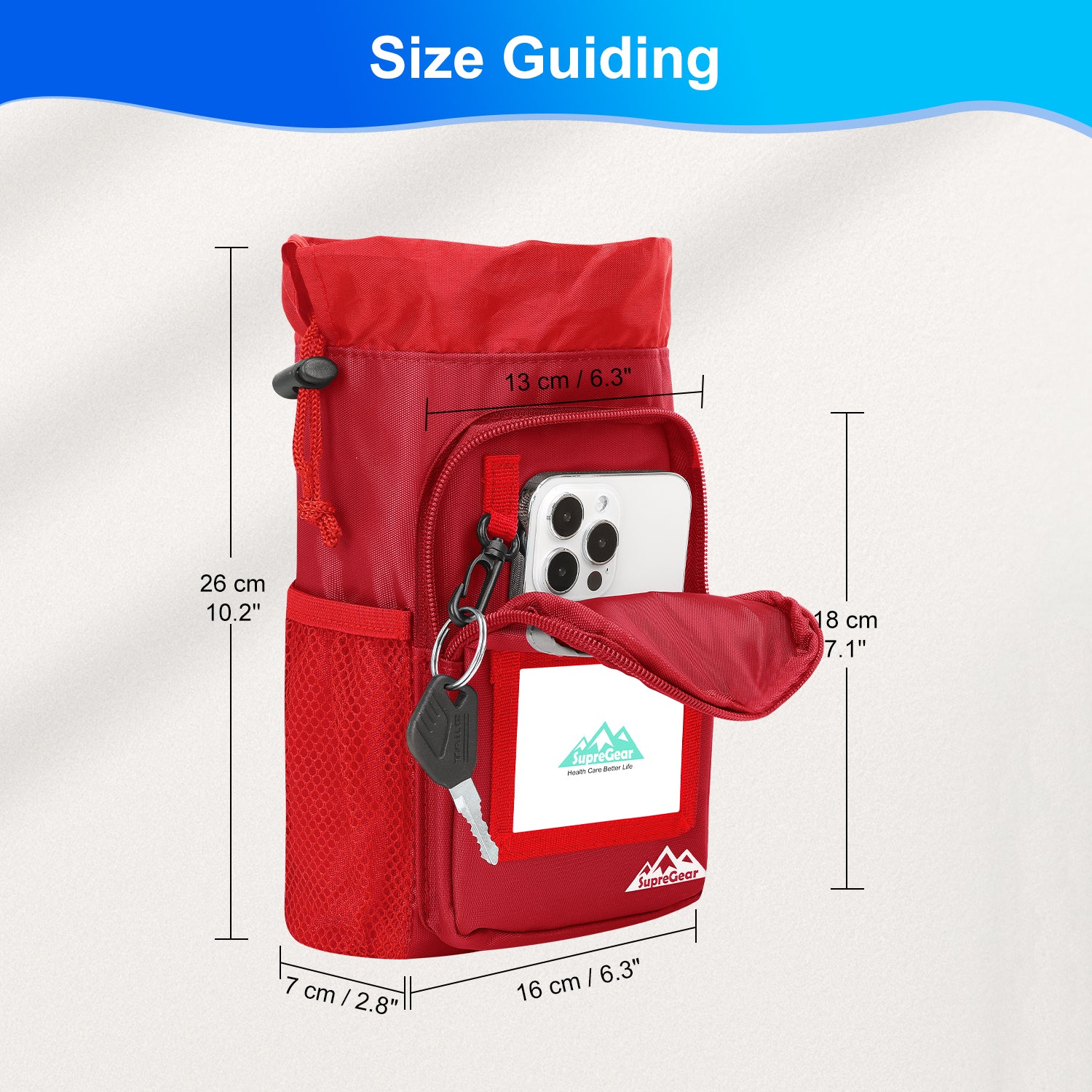 - Large Capacity: A main roomy bag with drawstring holds your drinks, umbrellas, newspaper; a front zipper pocket, a slide pocket, a card pocket and two side mesh pockets provide enough space for your cell phones, eyeglasses, remote control, wallet, cards, pens, earphones, keys, medical supplies and other small gadgets