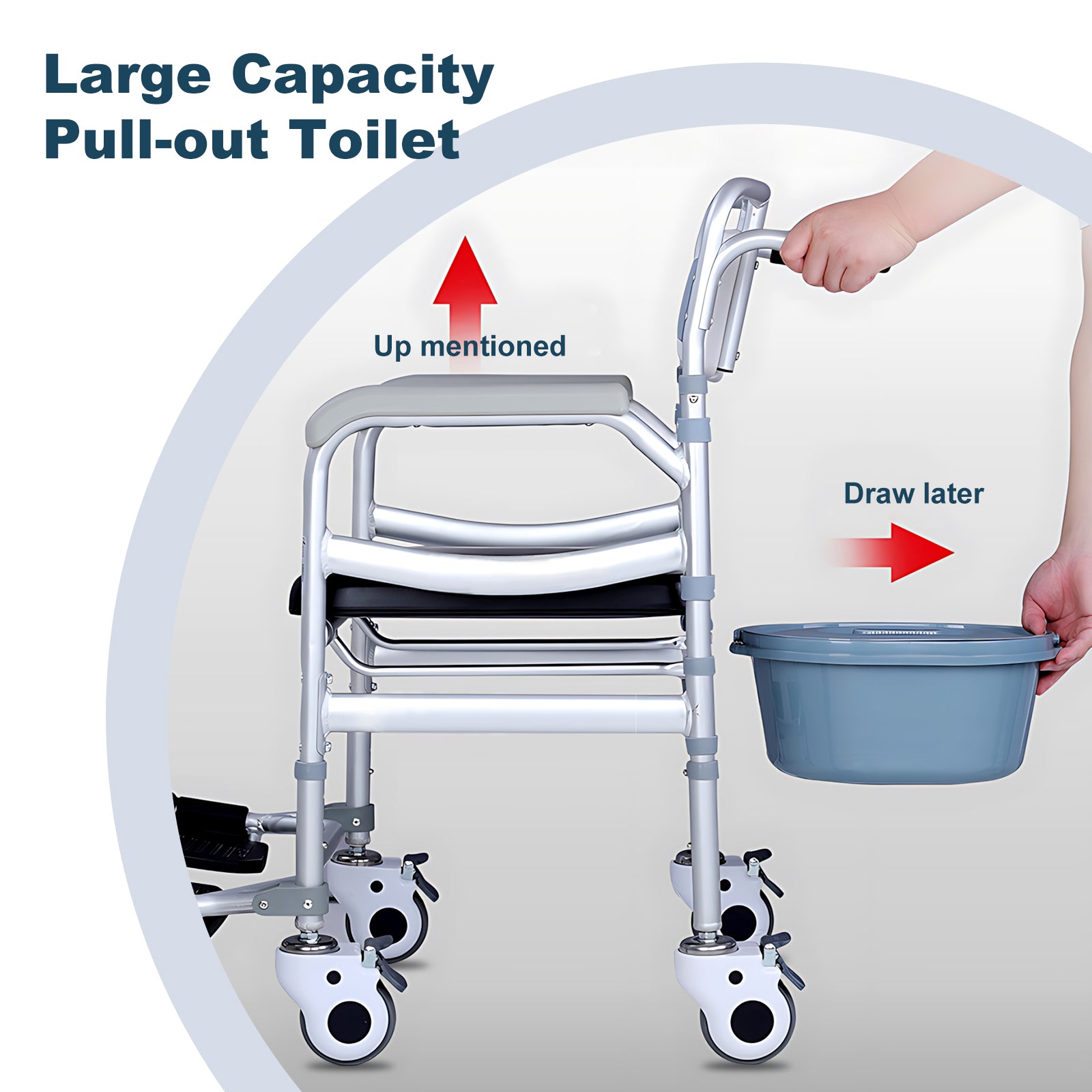 - Multi-Functional Use w/ Built-In Toilet: Serves as a shower chair, bedside commode with a built-in toilet, and indoor wheelchair. Height adjustable in 3 levels with seat height ranging from 19.7" to 21.65", making it adaptable for different users. Equipped with four 3.94-inch silent universal wheels, each with an independent brake for safe mobility.